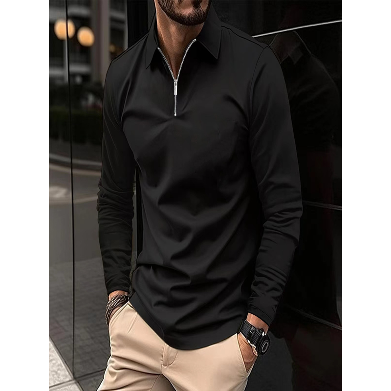 Zipper Men's Solid Color Long Sleeve Sports Polo Shirt Black S