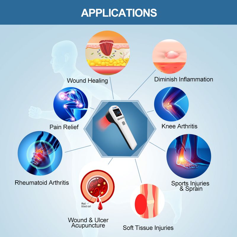 Wound Healing: Low Level Laser treatments stimulate cells and accelerate tissue regrowth, so this device can be used on wounds that need healing too. It will literally accelerate the healing process.
