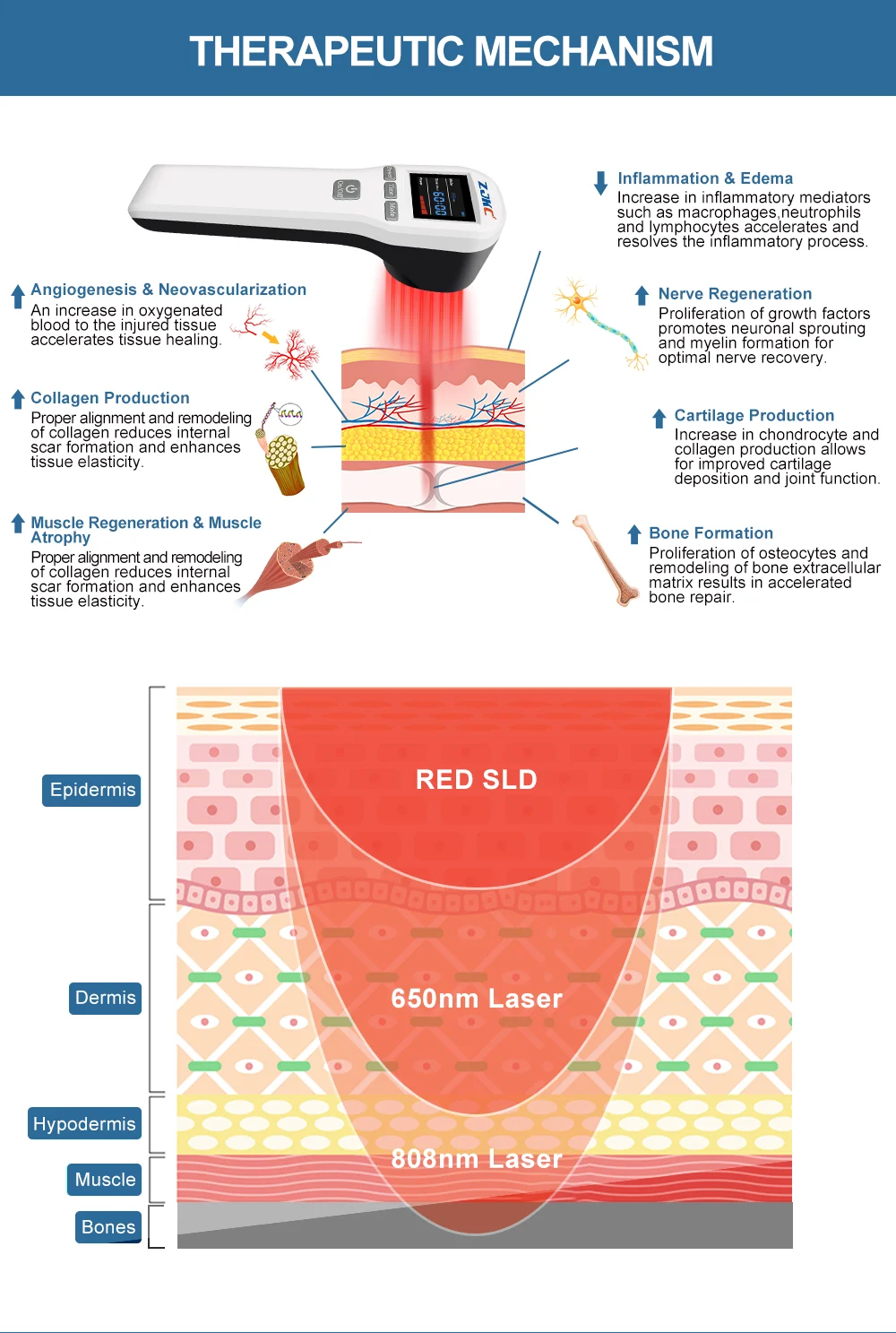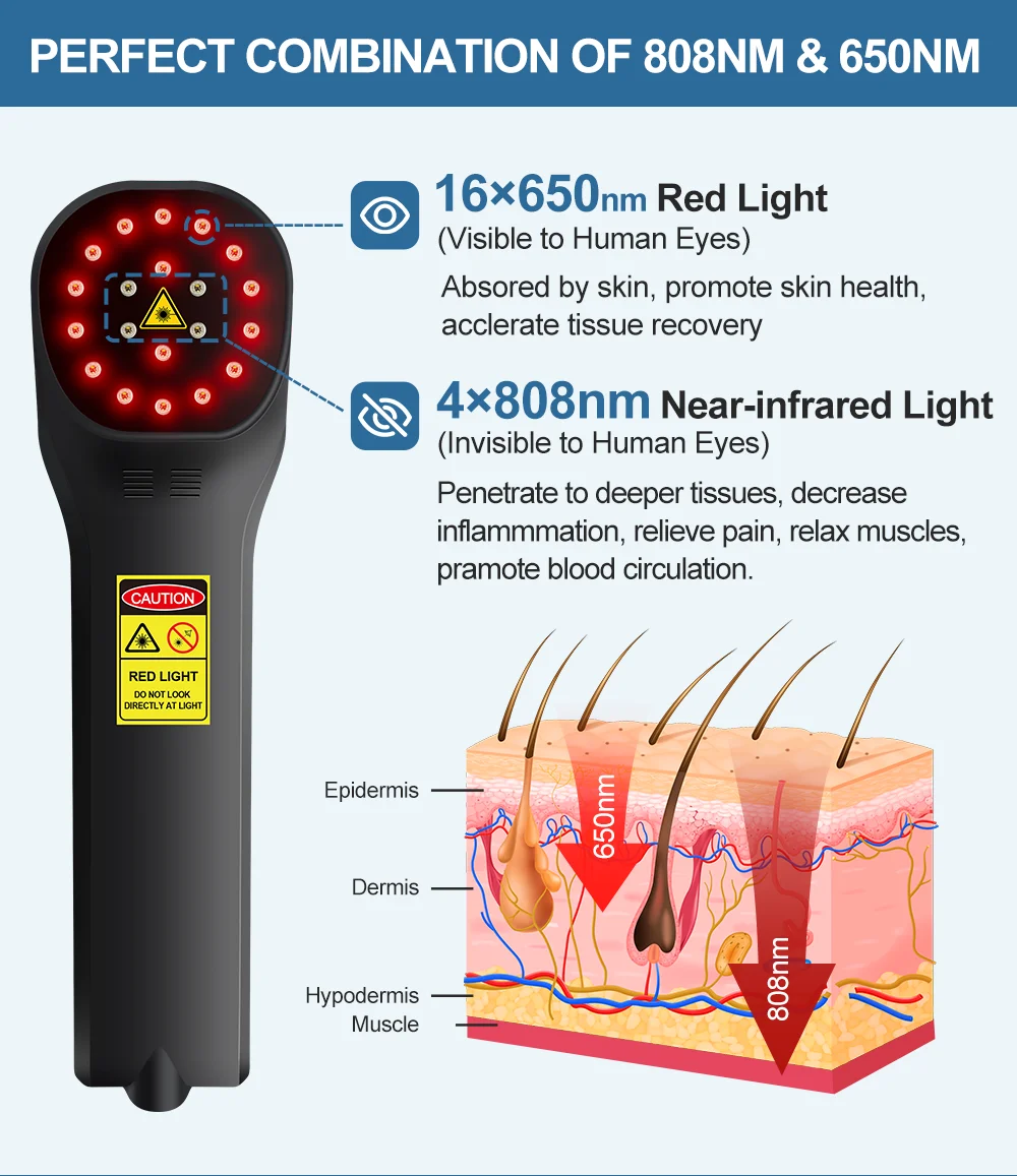 Wound Healing: Low Level Laser treatments stimulate cells and accelerate tissue regrowth, so this device can be used on wounds that need healing too. It will literally accelerate the healing process.