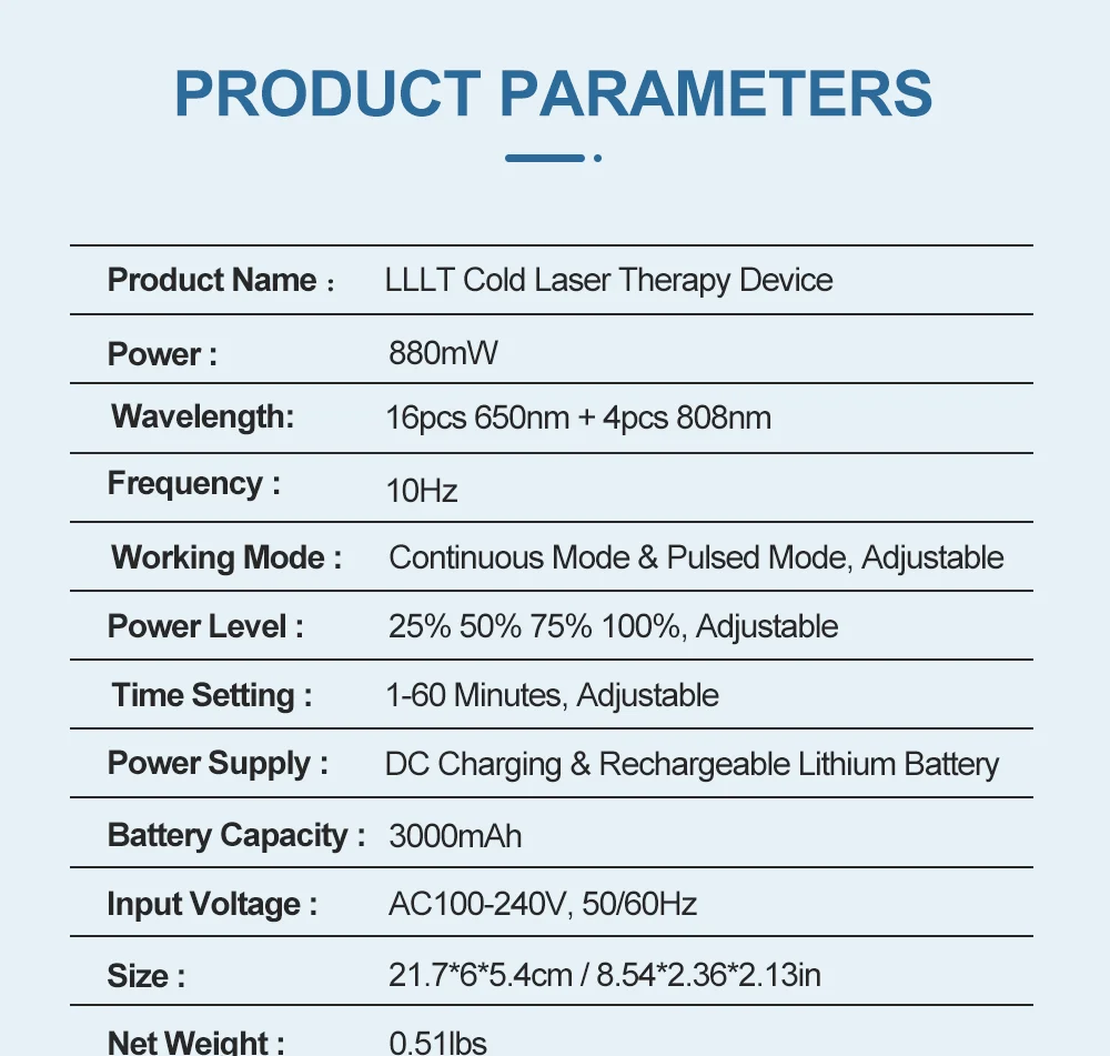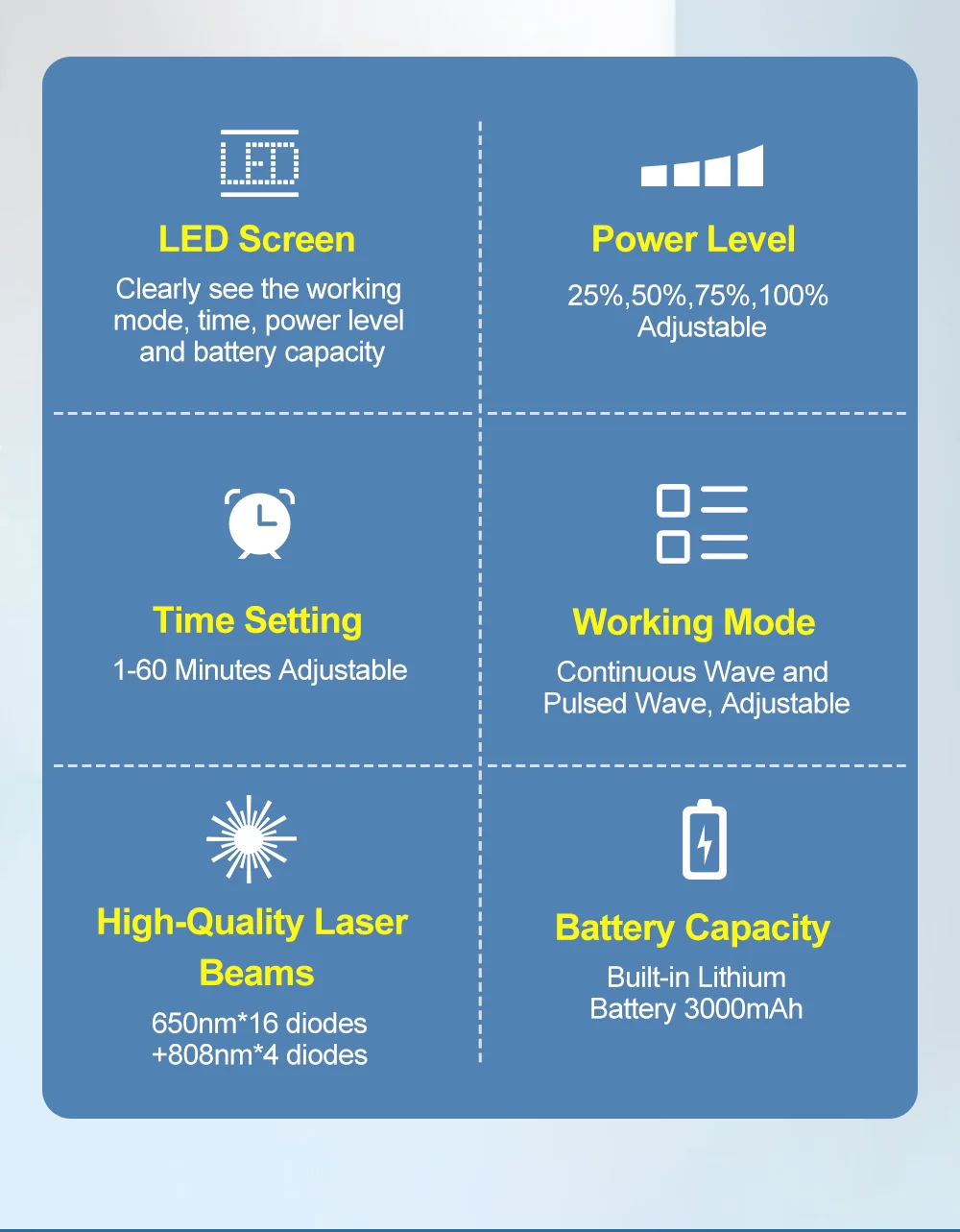 No Pain/Side Effects: Due to the low power grade of the laser therapy, the device will not cause any side effects or pain (heat included) while using this product. It is safe, non-invasive, and effective.Â