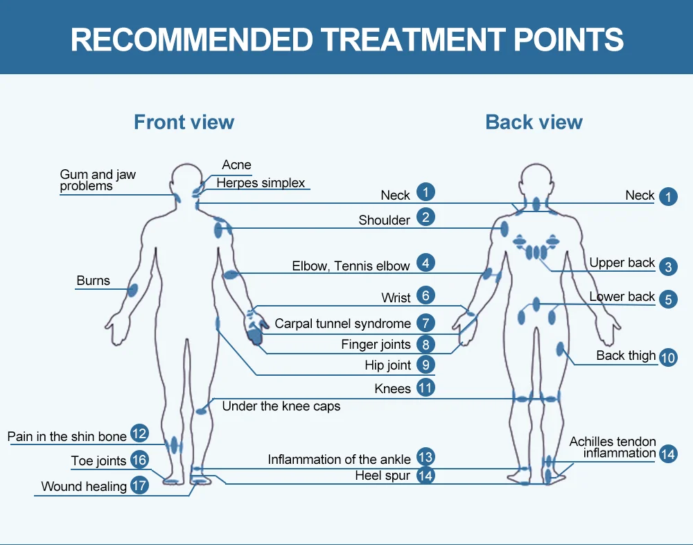 4 Power Levels: Adjust the power levels according to the type of injury or treatment you desire. Certain pain relief may require deeper penetrating laser power, whereas others that are more skin level need less power.