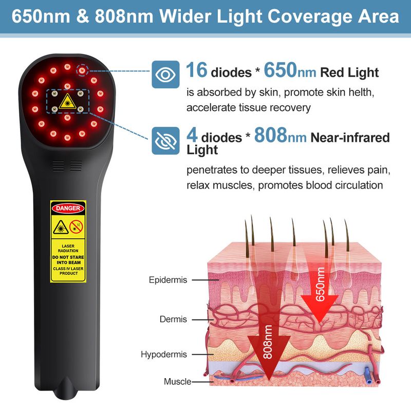 【Powerful】650nm to 900nm is the optimal wavelength Because it combines penetration depth (low absorption) and energy transfer efficiency. Our laser therapy machine combines infrared light laser with wavelengths of 650nm and 808nm. As is well known, 650nm can be easily absorbed by the skin to improve blood circulation and nerve related pain. 808nm red laser light can penetrate tissues and joints,laser device helping to treat arthritis and spinal pain, and is most suitable for deep tissue work.
