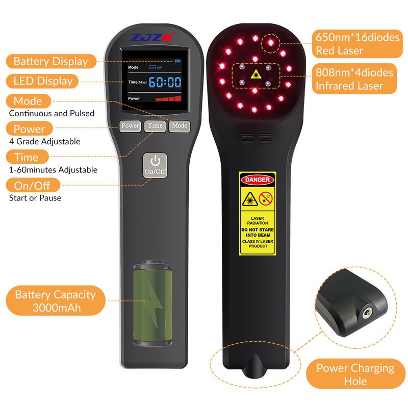 【human & pet cold laser】Near infrared laser for pain has been proven to be a non-toxic, painless, and non-invasive treatment method for humans and pets. Our medical laser treatment will not bring any side effects to you, and no discomfort during use. Equipped with a rechargeable 3000mAh lithium battery and a portable design, Four adjustable power levels: 25%, 50%, 75% and 100%.it allows you to receive cool laser treatment anywhere. It is also suitable for cats, dogs, horses, rabbits, and more.