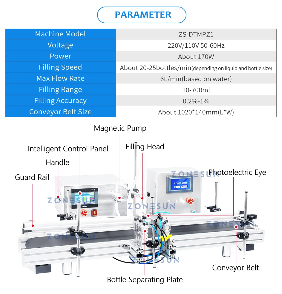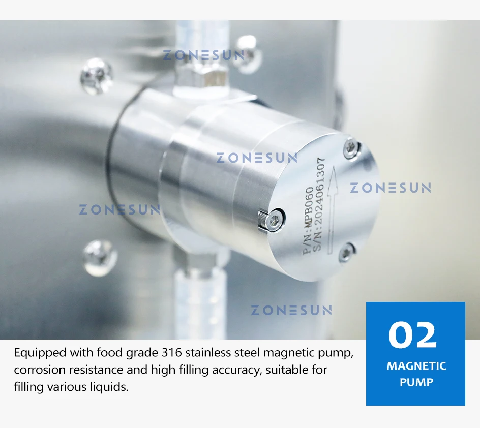 This is a small line of a filler, a control box and a conveyor. It is equipped with a magnetic pump, which brings high accuracy. Compared with other fillers, it is convenient that the operator can directly set the filling volume on this machine. It is applicable to thin liquids, such as water and juice. It is widely used in the food, biological, and daily chemical industries.