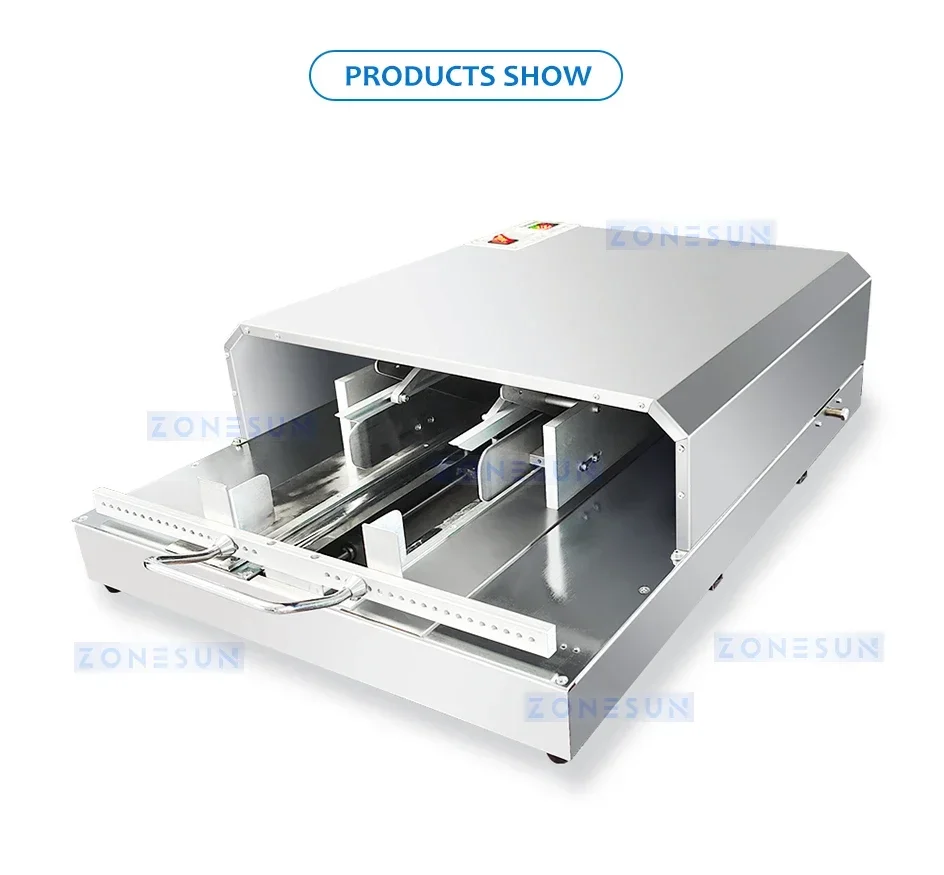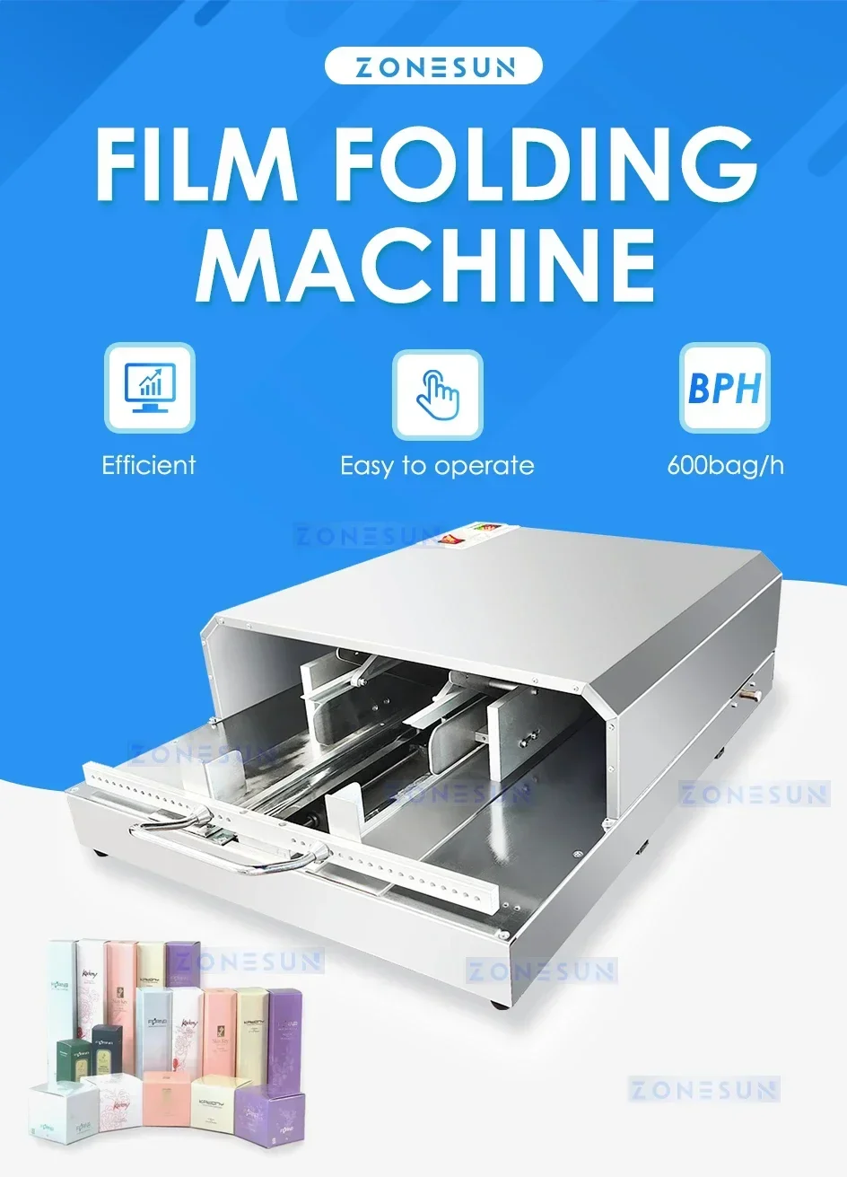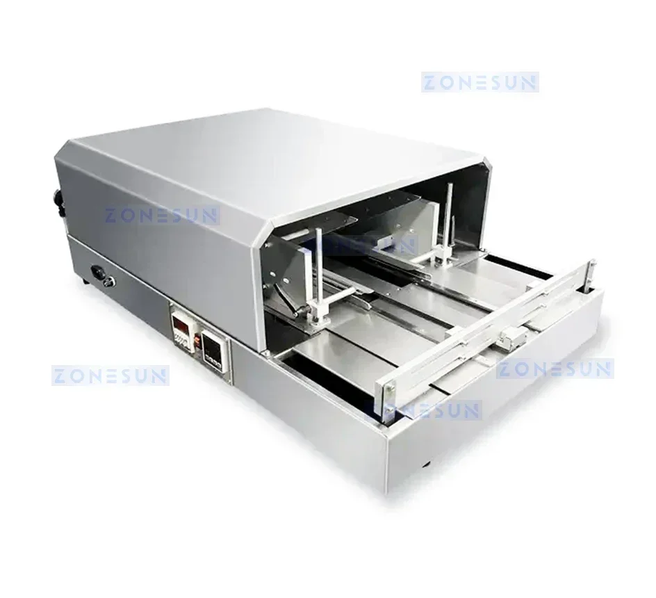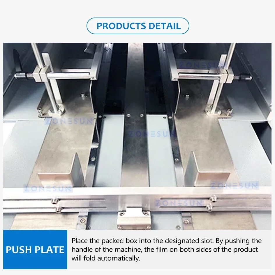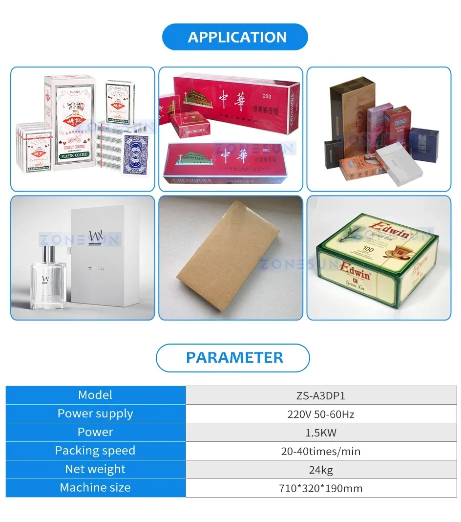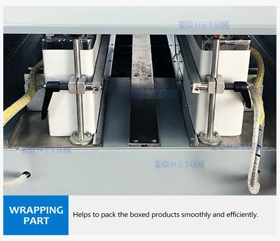 This cellophane overwrapping machine automates box wrapping with a pneumatic pusher for precise product feeding. Adjustable heat sealing ensures consistent, secure two-side seals on various film types.
