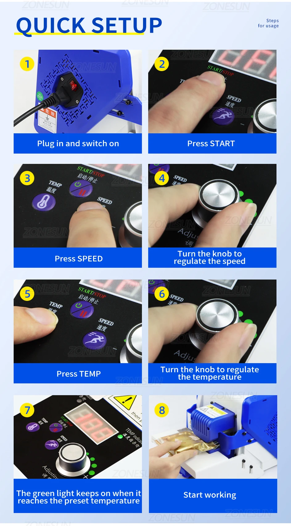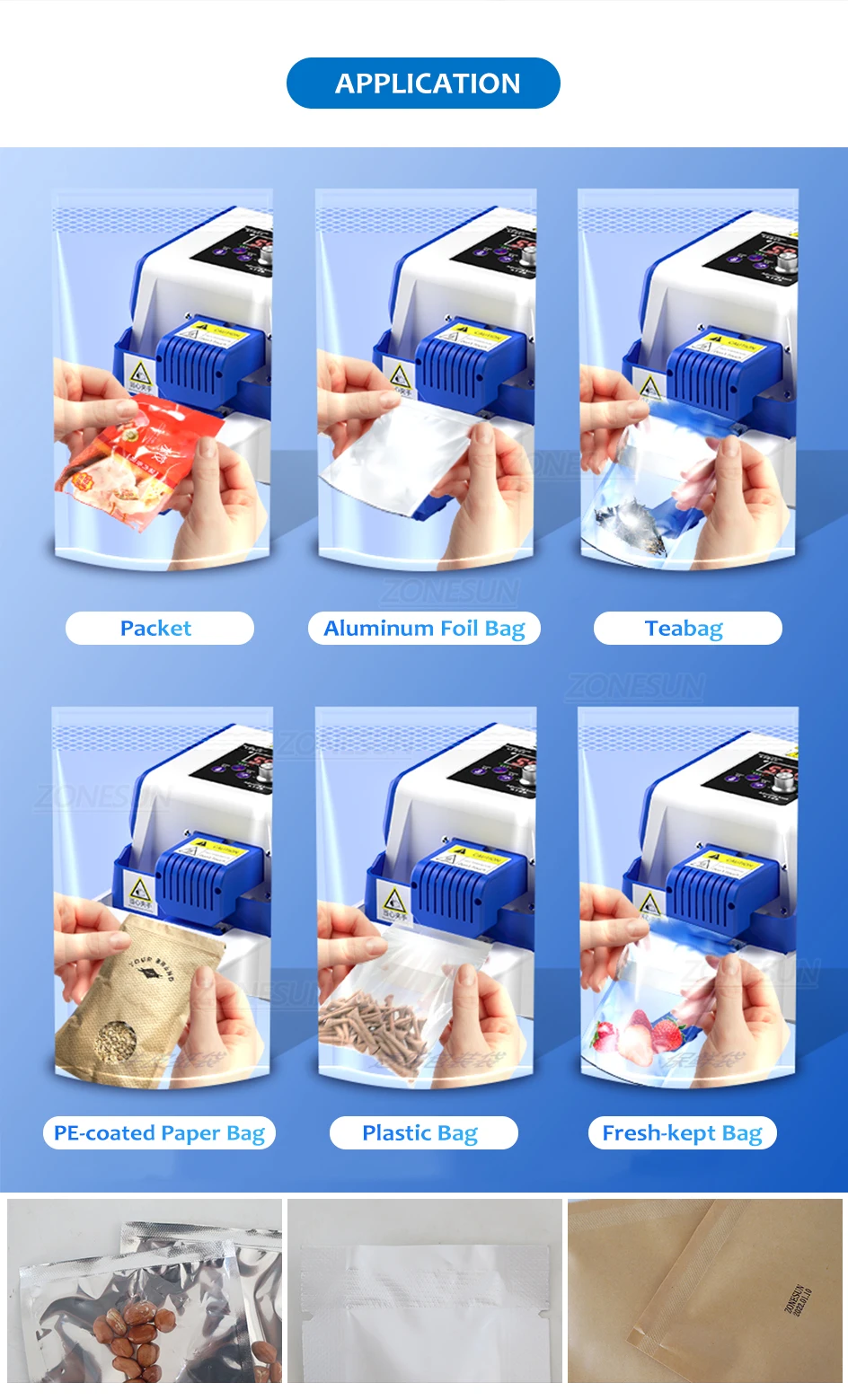 This sealer is used to seal bags or packets, including aluminum foil bags, plastic bags, PE-coated paper bags, tea bags, etc. It is widely used in the packing industry.