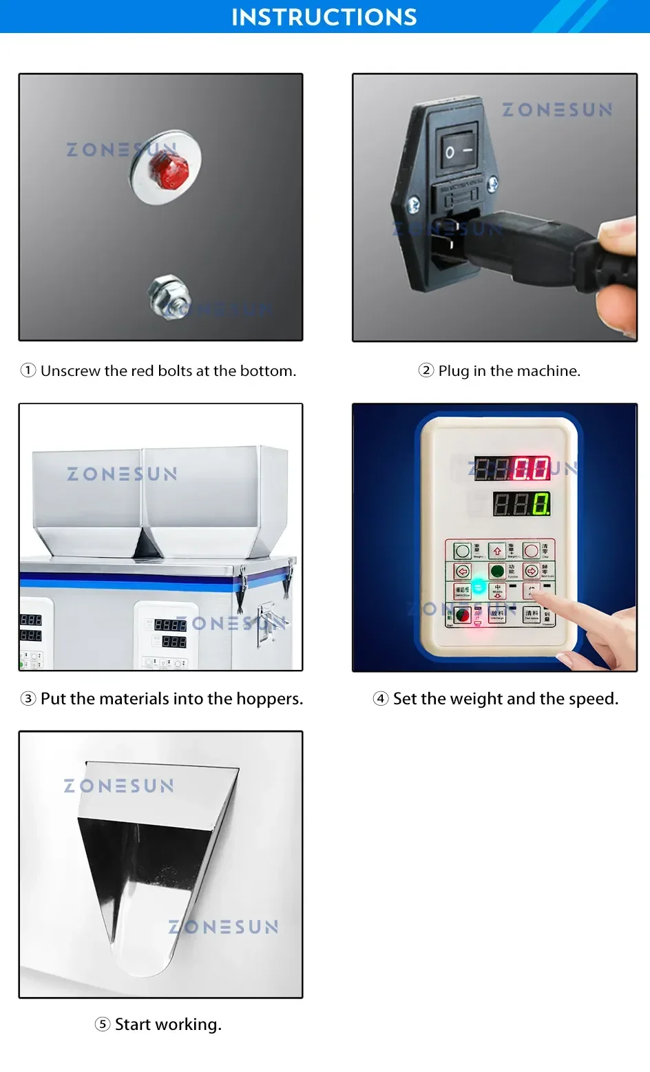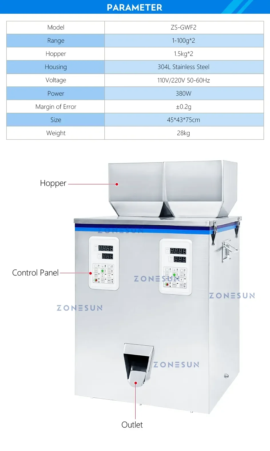 This is a digital control particle filling machine designed for efficiently packaging granular products. Users can simultaneously put 2 different granules into the hoppers. With 2 weighers, it is faster during the weighing process.
