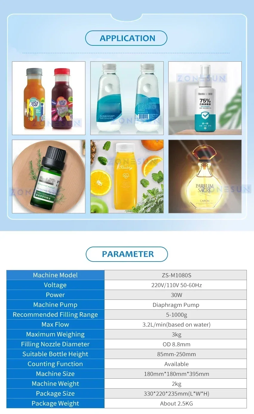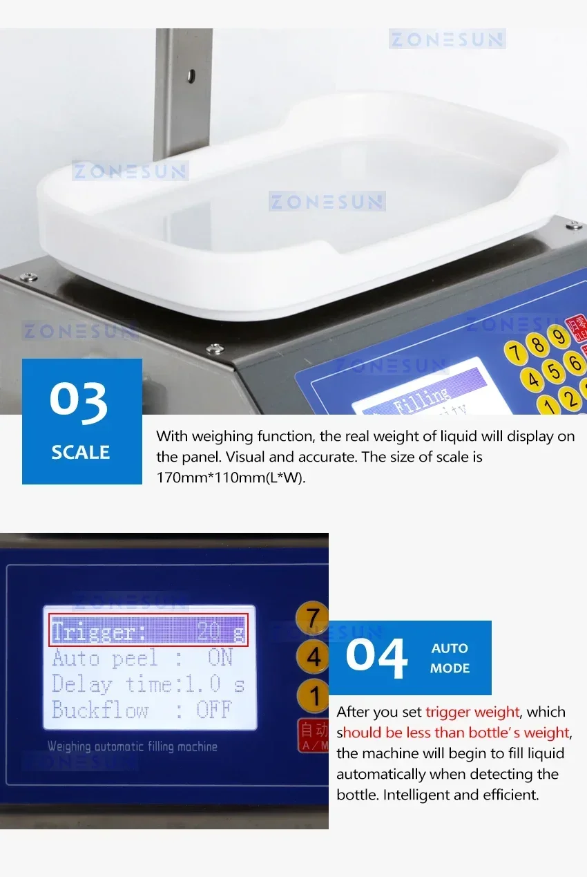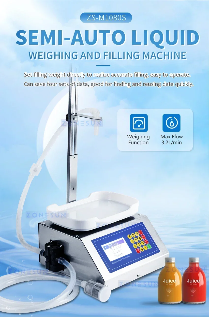 This machine is suitable for filling low-viscosity liquid, such as juice, milk, water, etc. You can set filling weight on panel directly, saving time on testing machine. The machine can be widely used in beverage, chemical, cosmetic industries.