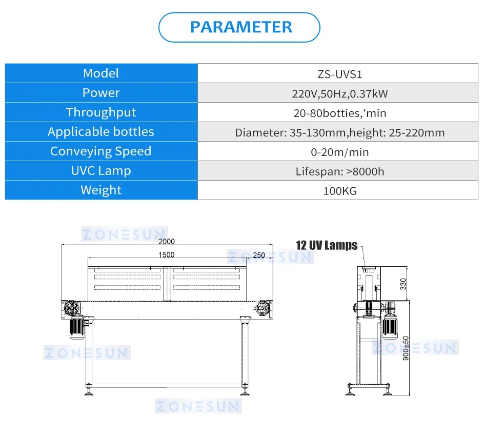 Zonesun ZS-UVS1 Inline UV Sterilizer Inductrial UV Tunnel UV Disinfection Lamp for Bottles Food Packaging