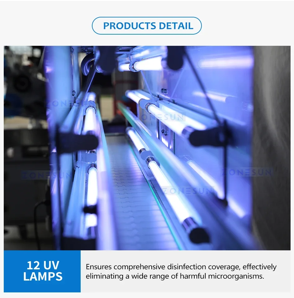 Introducing the cutting-edge UV Ultraviolet Sterilizer, designed to revolutionize your pre-treatment process for food bottles. This state-of-the-art machine boasts a tunnel design equipped with powerful UVC lamps, boasting an impressive lifespan exceeding 9000 hours.