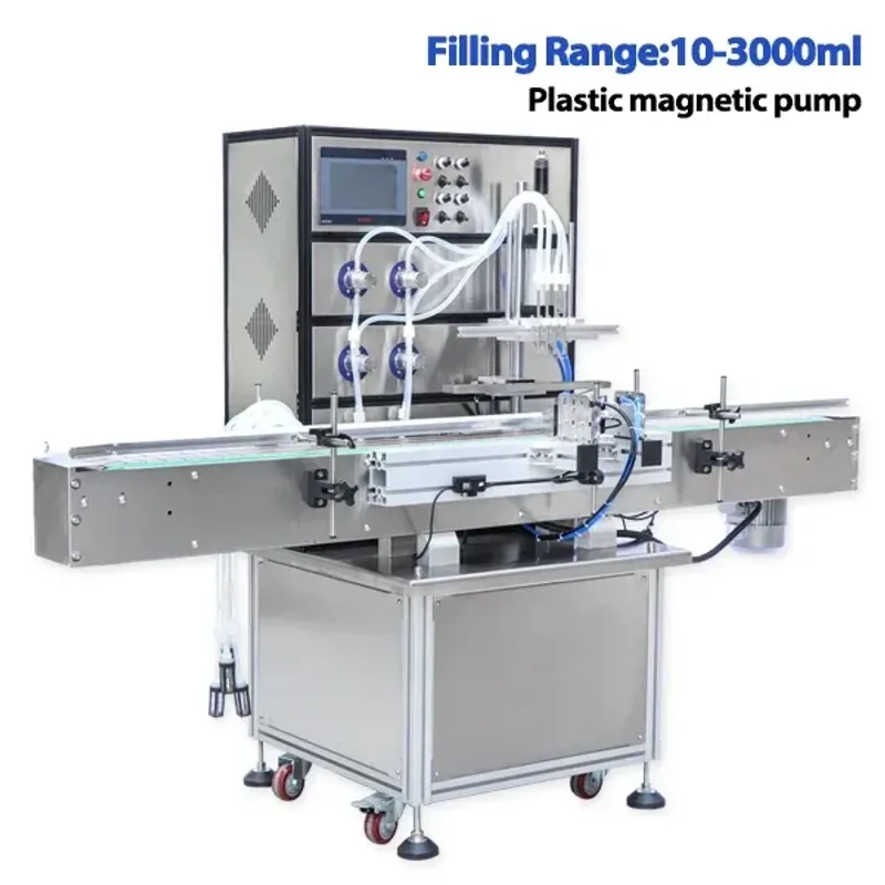 This machine is equipped with a magnetic pump which can help you fill liquid accurately.There are several nozzles and customers can control each nozzle separately if they need this.This full automatic liquid filling machine is with conveyor and can be used as one part of production line.These are all help you improve working efficiency greatly.